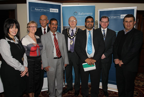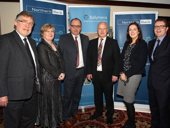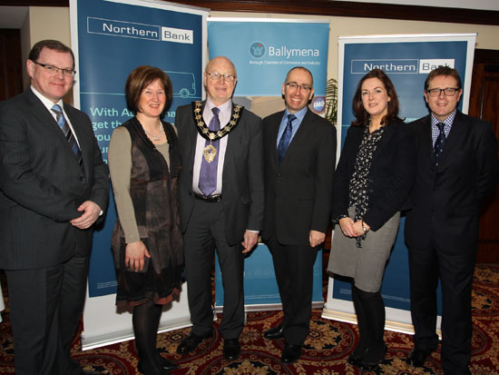 L-R Thomas McKillen (Chamber Vice President), Carol Wilson (Senior Branch Manager Northern Bank Ballymena), Mayor Hubert Nicholl, Kevin Kingston (Managing Director Business & Corporate, Northern Bank), Angela McGowan (Chief Economist Northern Bank) and Graham Lapsley (Head of Northern Bank Ballymena Business Centre)